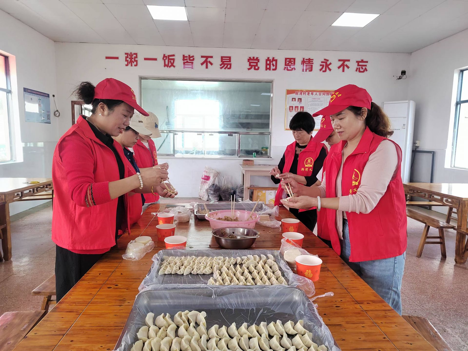 韓愛紅(右一)帶領(lǐng)志愿者為幸福食堂老人包餃子畫面。