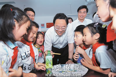 6月1日,武漢市武昌區(qū)為民小學(xué)。兩棵高大的榆樹在小小的院子灑滿了濃陰,一群孩子活蹦亂跳玩著游戲。省委書記俞正聲滿面春風(fēng)地來到了孩子們中間。