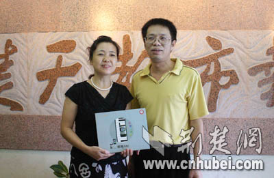 張女士在丈夫陪同下到楚天都市報領(lǐng)取獎品
