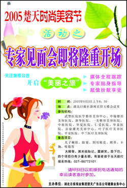荊楚網消息(楚天金報)2005楚天時尚美容節(jié)今起正式啟動,本集團將聯(lián)合武漢各大時尚美容機構,為愛美時尚人士提供各項時尚美容“大餐”。