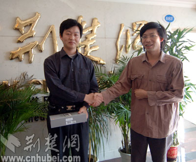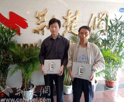 荊楚網(wǎng)24日訊 記者艾丹 潘頔 報道:23日抽出的“讀報紙、發(fā)短信、中手機(jī)”活動的兩位幸運(yùn)獲獎?wù)撸錆h的李先生和谷城的孟先生,今天下午來到荊楚網(wǎng)領(lǐng)獎,荊楚網(wǎng)總編輯閻思甜親自為他們頒獎。