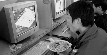 一位學生正在網(wǎng)吧玩網(wǎng)絡(luò)游戲,他坐在電腦前邊玩邊吃飯。南山攝
