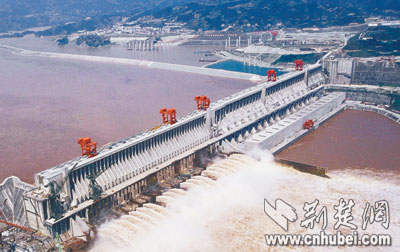 三峽工程建筑由大壩、水電站廠房和通航建筑物三大部分組成。大壩為混凝土重力壩,壩軸線全長(zhǎng)2309.47米,壩頂高程185米,最大壩高181米。設(shè)有23個(gè)泄洪深孔,最大泄洪能力可達(dá)102500立方米/秒。電站壩段位于大壩兩側(cè),共裝機(jī)26臺(tái),單機(jī)額定容量70萬千瓦的水輪發(fā)電機(jī)組,總裝機(jī)容量為1820萬千瓦,年發(fā)電量847億千瓦時(shí)。通航建筑物包括永久船閘和升船機(jī)。永久船閘為雙線五級(jí)連續(xù)梯級(jí)船閘。單級(jí)閘室可通過萬噸級(jí)船隊(duì)。