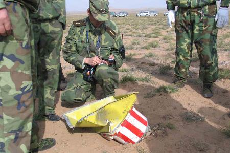 10月12日,搜索人員正在為磁記錄儀定位。當(dāng)日上午,神舟六號(hào)載人飛船火箭殘骸中最重要的磁記錄儀在內(nèi)蒙古鄂托克旗找到。搜索部隊(duì)說(shuō),磁記錄儀又稱(chēng)“黑匣子”,是飛船殘骸中最重要的部件,將被直接送到北京進(jìn)行數(shù)據(jù)分析。