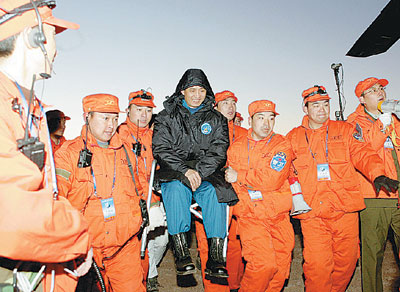 5分鐘后,兩名航天員在工作人員的簇?fù)硐,進(jìn)入著陸點100米開外的一架直升機(jī)內(nèi)全面體檢,工作人員和群眾在外焦急地等待最后的檢查結(jié)果。