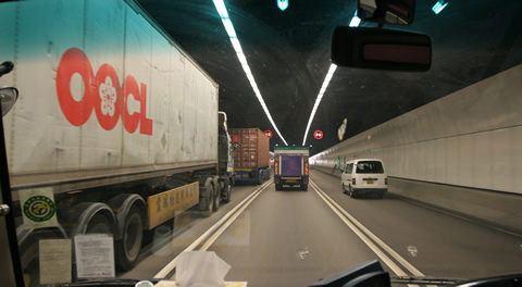 穿流不息的集裝箱貨柜車流通過(guò)海底隧道
