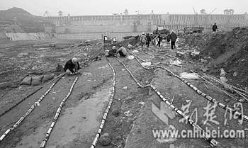 2月27日下午,雨霧中的爆破現(xiàn)場(chǎng)一片寂靜。6條長(zhǎng)90米、直徑0.6米的吸水鋼管已停止向圍堰基坑內(nèi)充水;觾(nèi),一泓江水微波蕩漾。