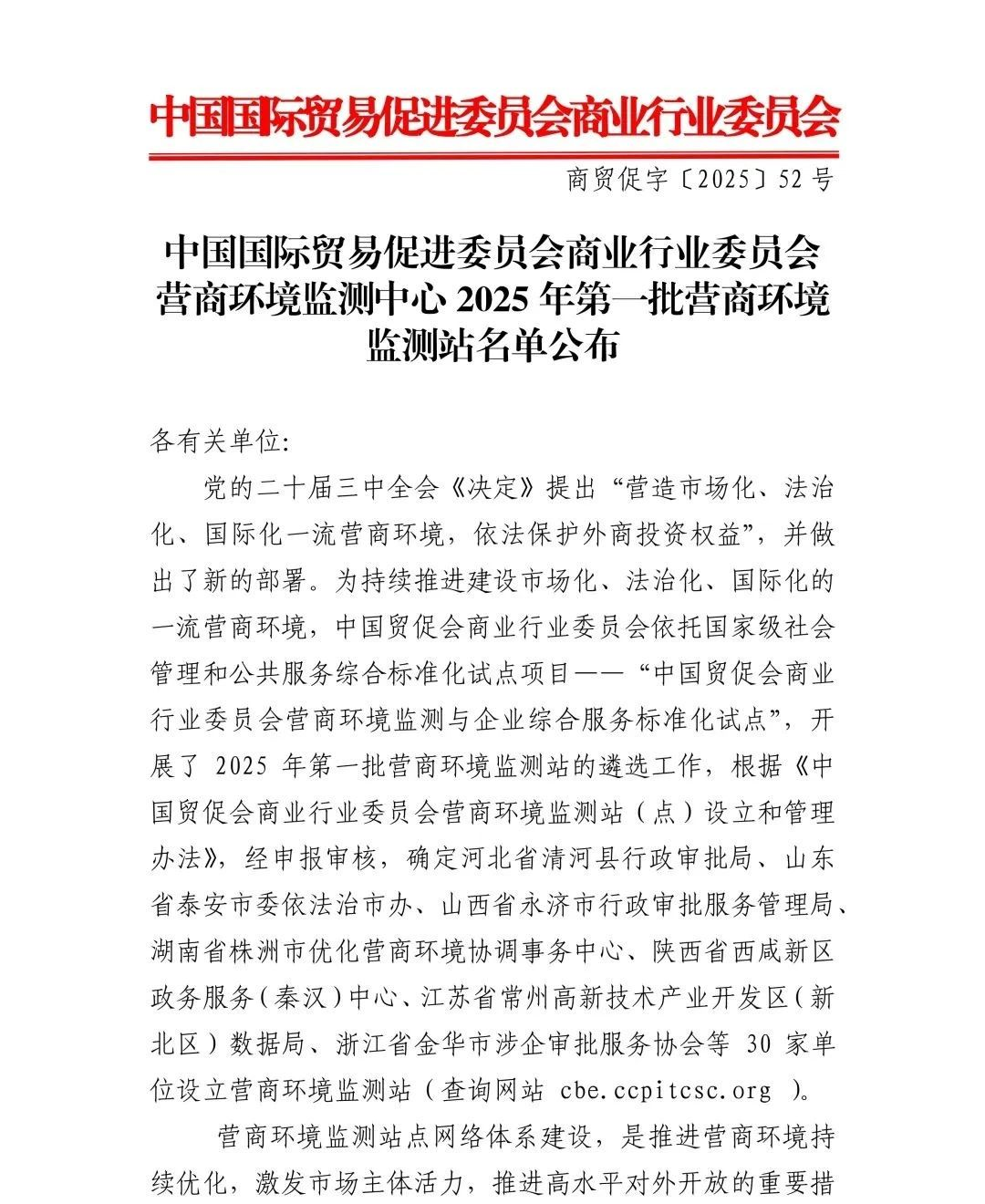 為持續(xù)推進(jìn)建設(shè)市場化、法治化、國際化的一流營商環(huán)境,中國貿(mào)促會商業(yè)行業(yè)委員會依托國家級社會管理和公共服務(wù)綜合標(biāo)準(zhǔn)化試點項目——“中國貿(mào)促會商業(yè)行業(yè)委員會營商環(huán)境監(jiān)測與企業(yè)綜合服務(wù)標(biāo)準(zhǔn)化試點”,開展了2025年第一批營商環(huán)境監(jiān)測站的遴選工作,根據(jù)《中國貿(mào)促會商業(yè)行業(yè)委員會營商環(huán)境監(jiān)測站(點)設(shè)立和管理辦法》,經(jīng)申報審核,確定湖北省孝感市孝南區(qū)營商環(huán)境促進(jìn)中心、河北省清河縣行政審批局、江蘇省常州高新技術(shù)產(chǎn)業(yè)開發(fā)區(qū)(新北區(qū))數(shù)據(jù)局、浙江省金華市涉企審批服務(wù)協(xié)會等30家單位設(shè)立營商環(huán)境監(jiān)測站。