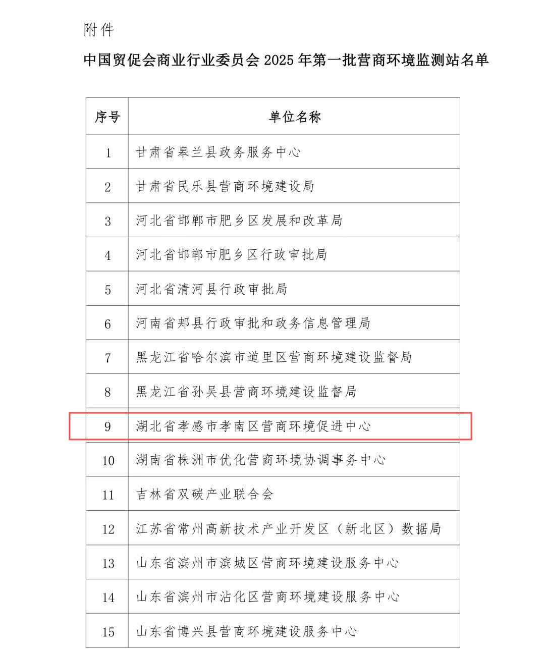 荊楚網(wǎng)(湖北日報網(wǎng))訊(通訊員 王佳玉)2月19日,中國國際貿(mào)易促進(jìn)委員會商業(yè)行業(yè)委員會公布了2025年第一批營商環(huán)境監(jiān)測站名單,孝南區(qū)營商環(huán)境促進(jìn)中心入選,為本次湖北省唯一入選縣市區(qū)。湖北首衡城農(nóng)產(chǎn)品有限公司、湖北港榮食品有限公司、湖北爽露爽食品股份有限公司、銘冠(湖北)包裝材料有限公司等30家企業(yè)入選營商環(huán)境觀測點。
