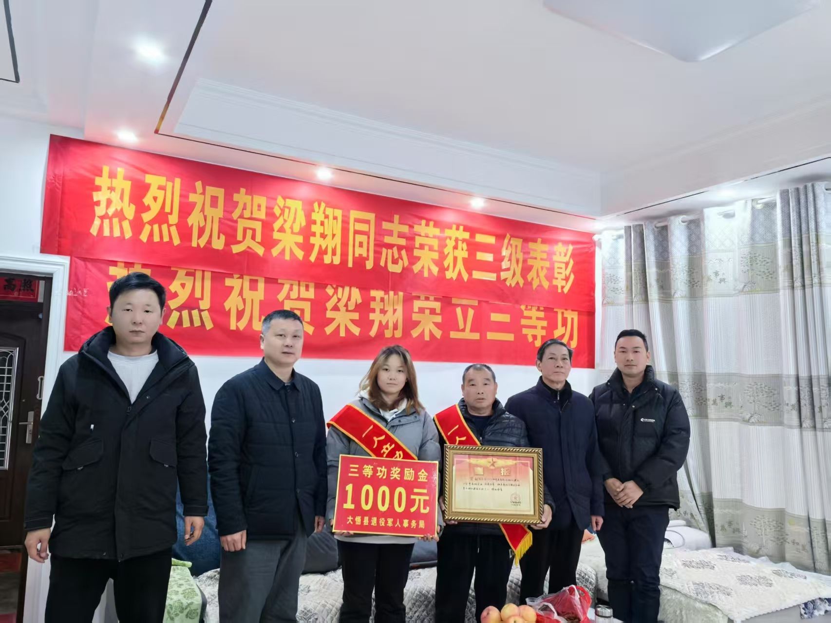 荊楚網(wǎng)(湖北日報網(wǎng))訊(通訊員 張?zhí)K軍)五年磨一劍,軍營建功顯本色;兩度獲殊榮,喜報送家揚(yáng)美名。2月20日,大悟縣退役軍人事務(wù)局和城關(guān)鎮(zhèn)退役軍人服務(wù)站工作人員為立功現(xiàn)役軍人送去喜報并慰問家屬,將一份承載著榮譽(yù)的三級表彰喜報送到梁翔家中,讓軍屬共享這份榮耀。