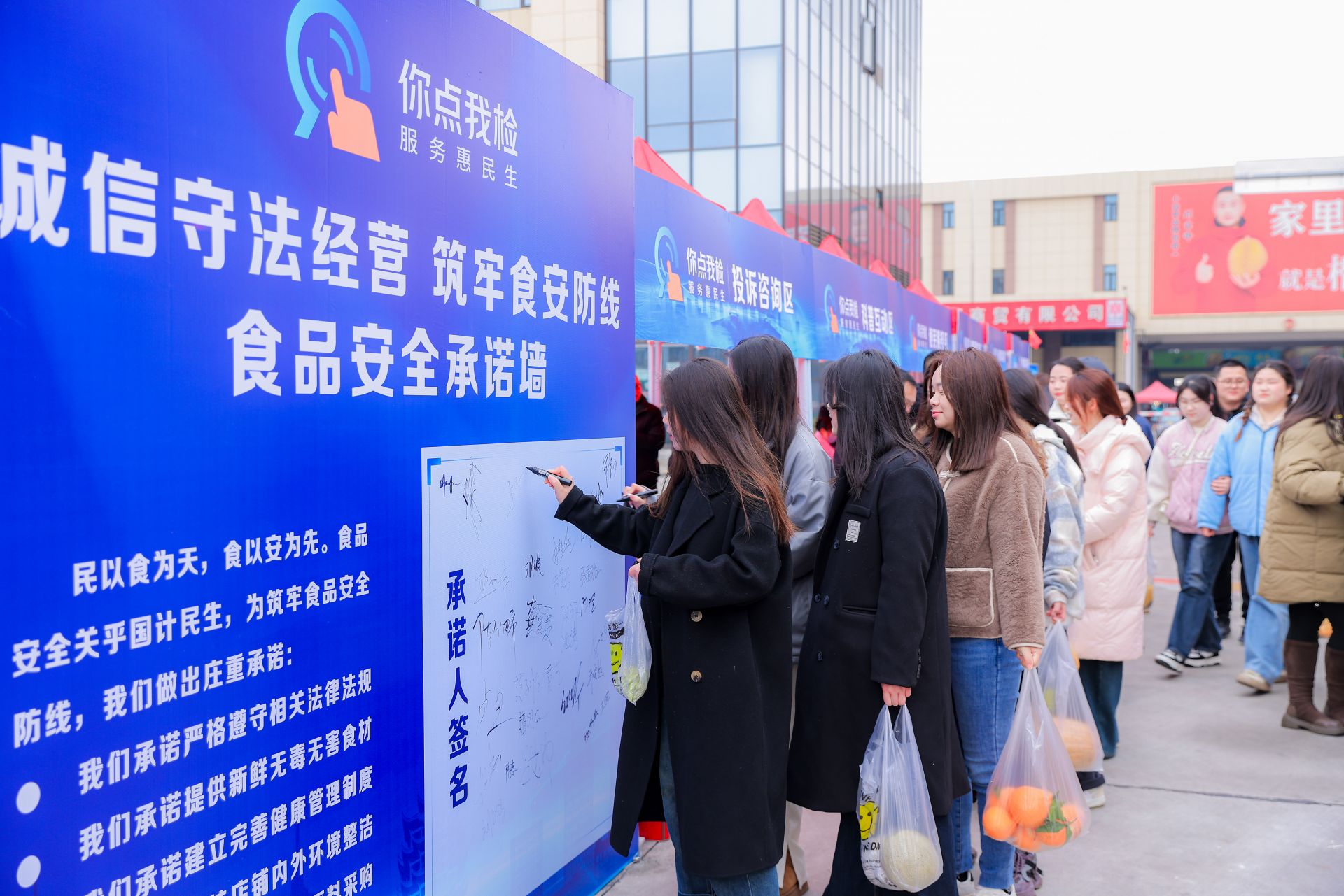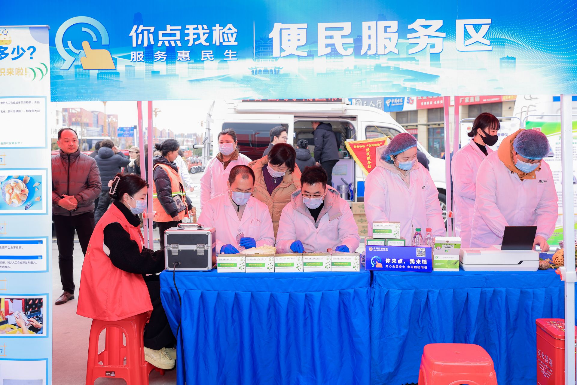 在隨后舉辦的現(xiàn)場活動中,工作人員設(shè)置了問卷填寫、便民服務(wù)、科普互動、投訴咨詢等多個區(qū)域與群眾積極互動。在問卷填寫區(qū),引導(dǎo)群眾通過使用“你點我檢 服務(wù)惠民生”民意征集系統(tǒng),點選想要抽檢的食品品類、場所和項目;在便民服務(wù)區(qū),接受群眾送檢食材,并開展現(xiàn)場檢驗;在科普互動區(qū),通過發(fā)放科普折頁和開展知識轉(zhuǎn)盤有獎答題等形式,向群眾宣傳食品安全知識;在投訴咨詢區(qū),向群眾普及消費維權(quán)知識,并現(xiàn)場受理投訴舉報,維護(hù)消費者合法權(quán)益。除此之外,現(xiàn)場還設(shè)置了“點選征集公示欄”,對前期群眾點選意見予以公示;設(shè)置了食品安全承諾墻,號召經(jīng)營者通過簽名形式承諾誠信守法,牢記食品安全責(zé)任。
