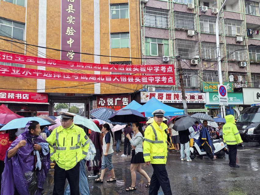 在交通保障方面,100名交警(包括5個農村中隊)全員上崗,他們在暴雨中堅守崗位,疏導交通、維護秩序,為送考車輛開辟“綠色通道”,保障道路暢通無阻,確??忌軌驕蕰r、安全地到達考點。