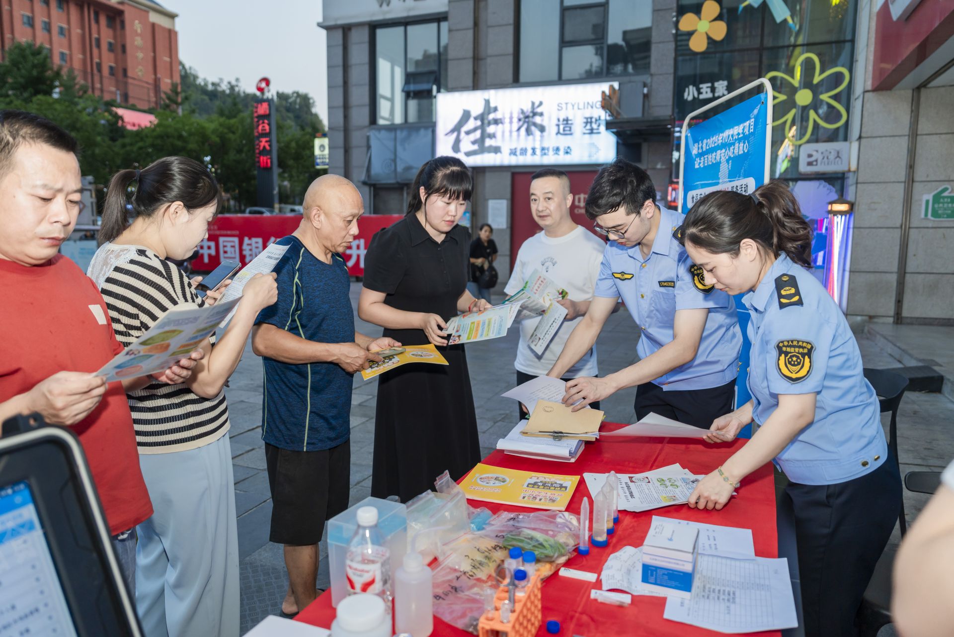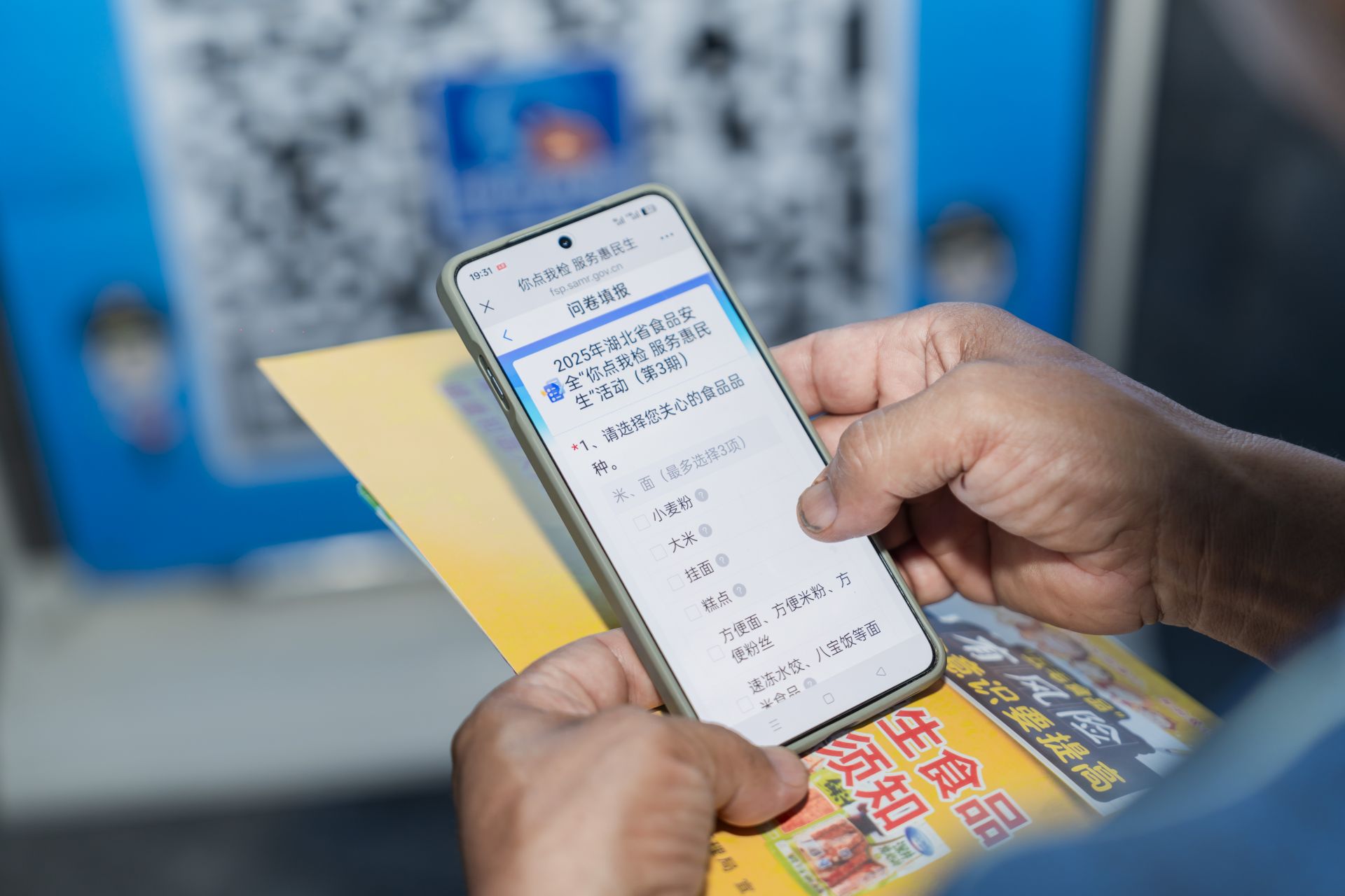 “大叔,您用手機(jī)掃一掃這個二維碼,就可以參與點選?!痹诨顒蝇F(xiàn)場,市場監(jiān)管工作人員向來往群眾發(fā)放調(diào)查問卷及食品安全科普資料,并邀請消費者通過掃碼進(jìn)入“你點我檢 服務(wù)惠民生”民意征集系統(tǒng),勾選自己關(guān)心的食品種類、經(jīng)營場所、檢測項目?!跋奶焯鞖鉄幔紣埸c外賣,希望你們多檢測一下”。在問卷征集過程中,不少消費者提出比較關(guān)注外賣食品安全。