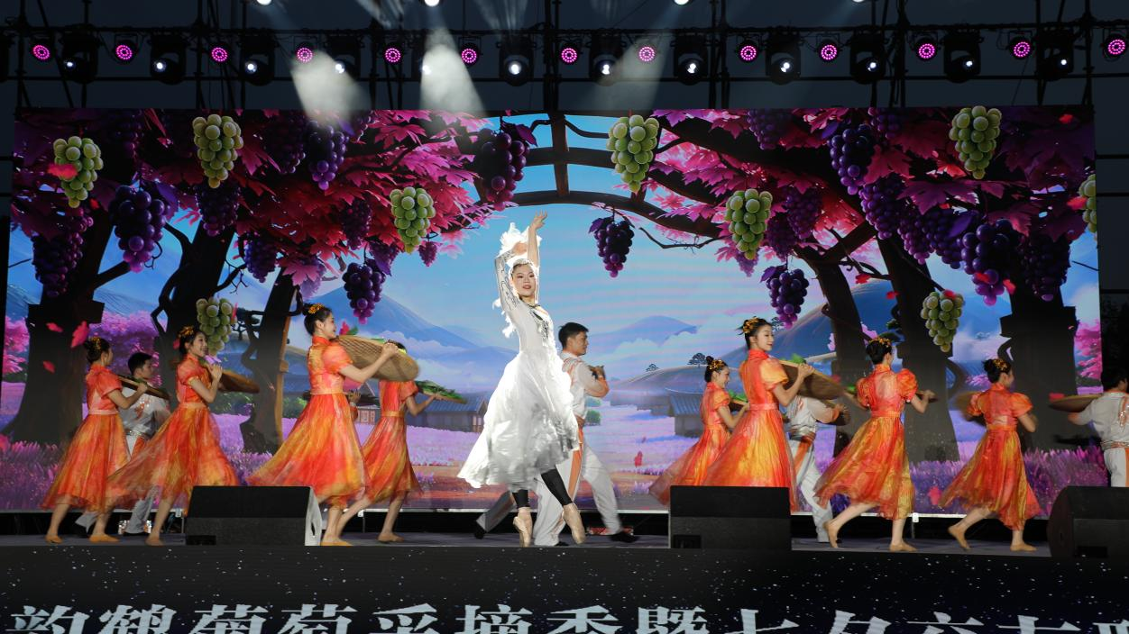 夜幕降臨,采摘季主題晚會(huì)如期上演。湖北省歌劇舞劇院帶來的《鶴舞云天?歡聚葡園》驚艷全場,小品、魔術(shù)、抽獎(jiǎng)互動(dòng)環(huán)節(jié)接連登場,歌唱家獻(xiàn)唱經(jīng)典曲目,現(xiàn)場氛圍熱烈。情景講述《仙鶴歸來是故鄉(xiāng)》更是生動(dòng)再現(xiàn)了黃灼初返鄉(xiāng)創(chuàng)業(yè)的艱辛與溫暖。