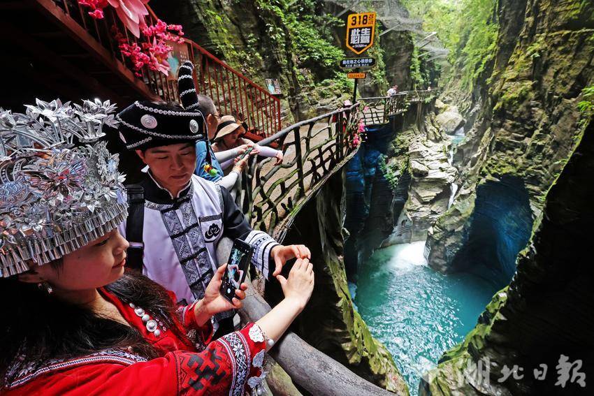 深入谷底,抵達被《中國國家地理》認證推薦的最佳取景位!該點位以天光一線、碧水環(huán)繞的天然畫框景觀著稱,為游客提供標準化取景平臺,可完整呈現(xiàn)峽谷地質(zhì)奇觀與生態(tài)之美。