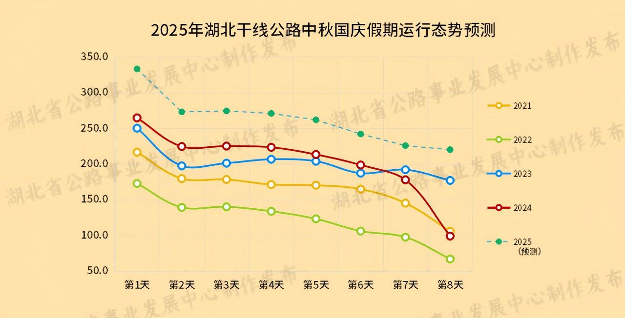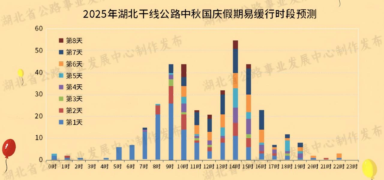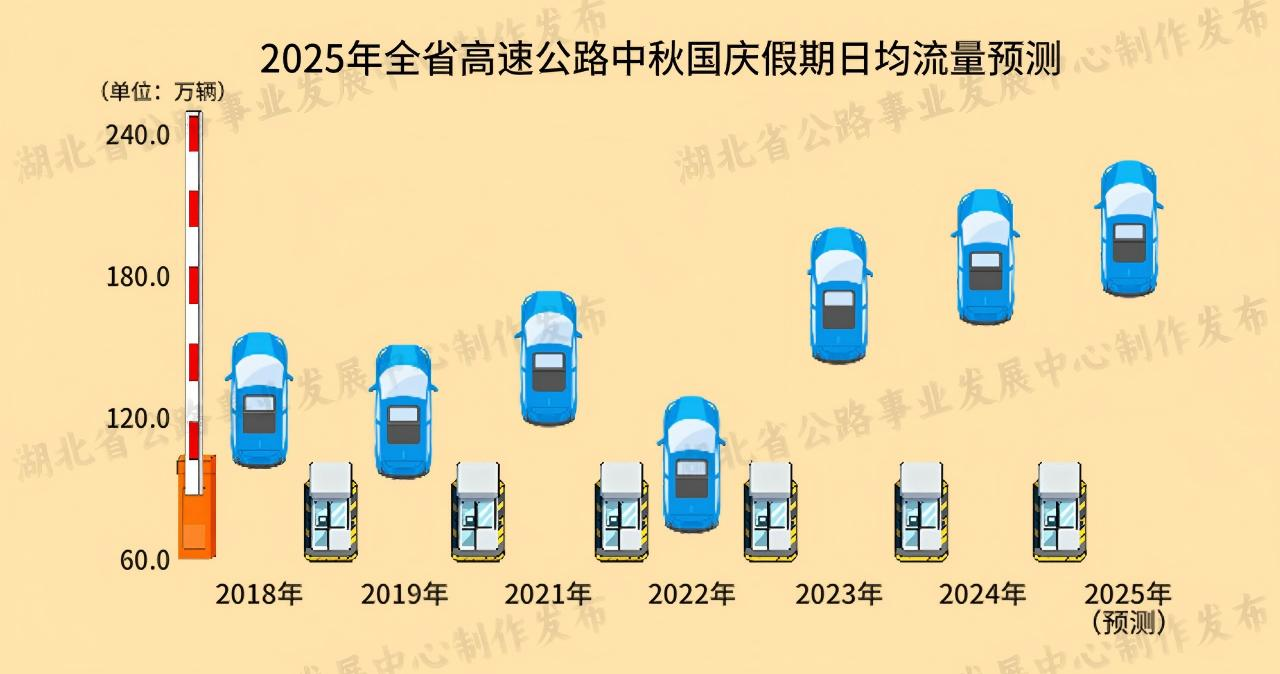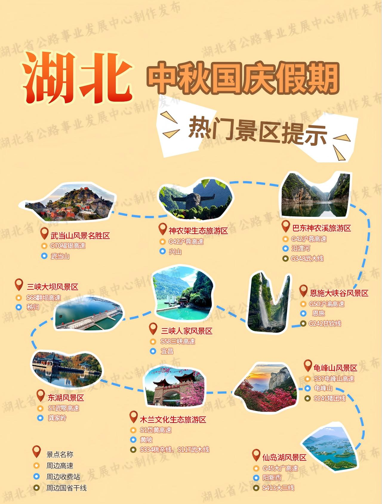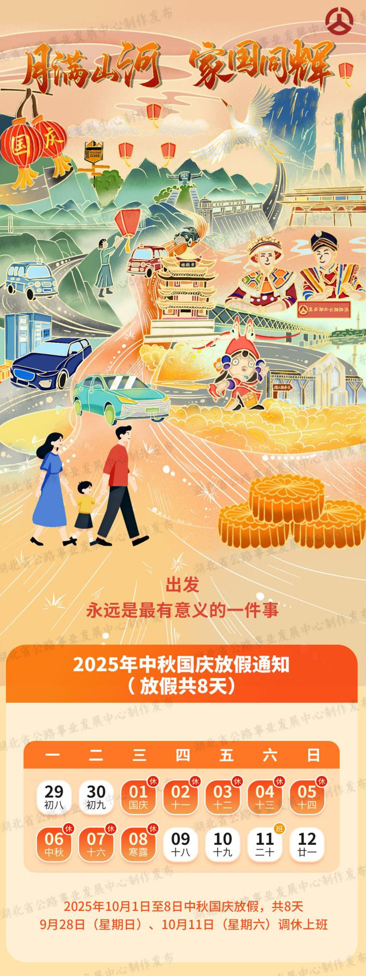 2025年中秋國慶假期即將到來,放假時間為10月1日至10月8日。根據(jù)國務院發(fā)布的《關于批轉交通運輸部等部門重大節(jié)假日免收小型客車通行費實施方案的通知》,中秋國慶假期期間,收費公路對7座及以下小型客車免費通行,免費時間段為10月1日0時至10月8日24時,共計八天。湖北省公路事業(yè)發(fā)展中心根據(jù)歷年來中秋國慶假期全省公路網(wǎng)運行監(jiān)測情況分析,預計今年中秋國慶期間路網(wǎng)流量較平日大幅增長,社會公眾探親訪友、度假旅游等中短途出行需求將會集中釋放,省內(nèi)各市州周邊路段和通往省內(nèi)知名景區(qū)路段的交通流量將出現(xiàn)明顯增幅,省內(nèi)國高網(wǎng)、國省干線、武漢市周邊路段易出現(xiàn)不同程度的擁堵緩行?,F(xiàn)編制《2025年中秋國慶假期湖北省干線公路出行指南》,為公眾平安便捷出行提供參考。