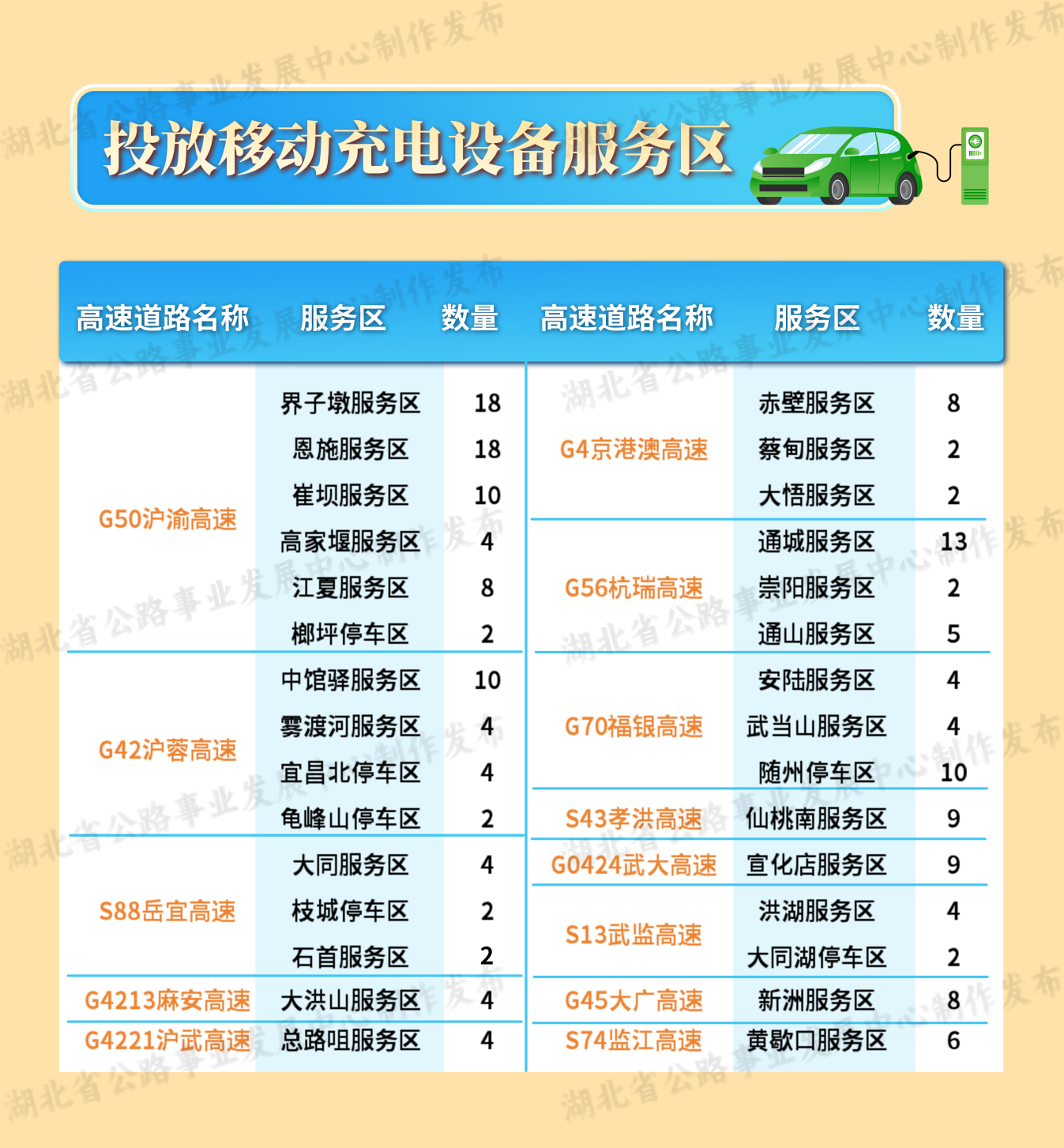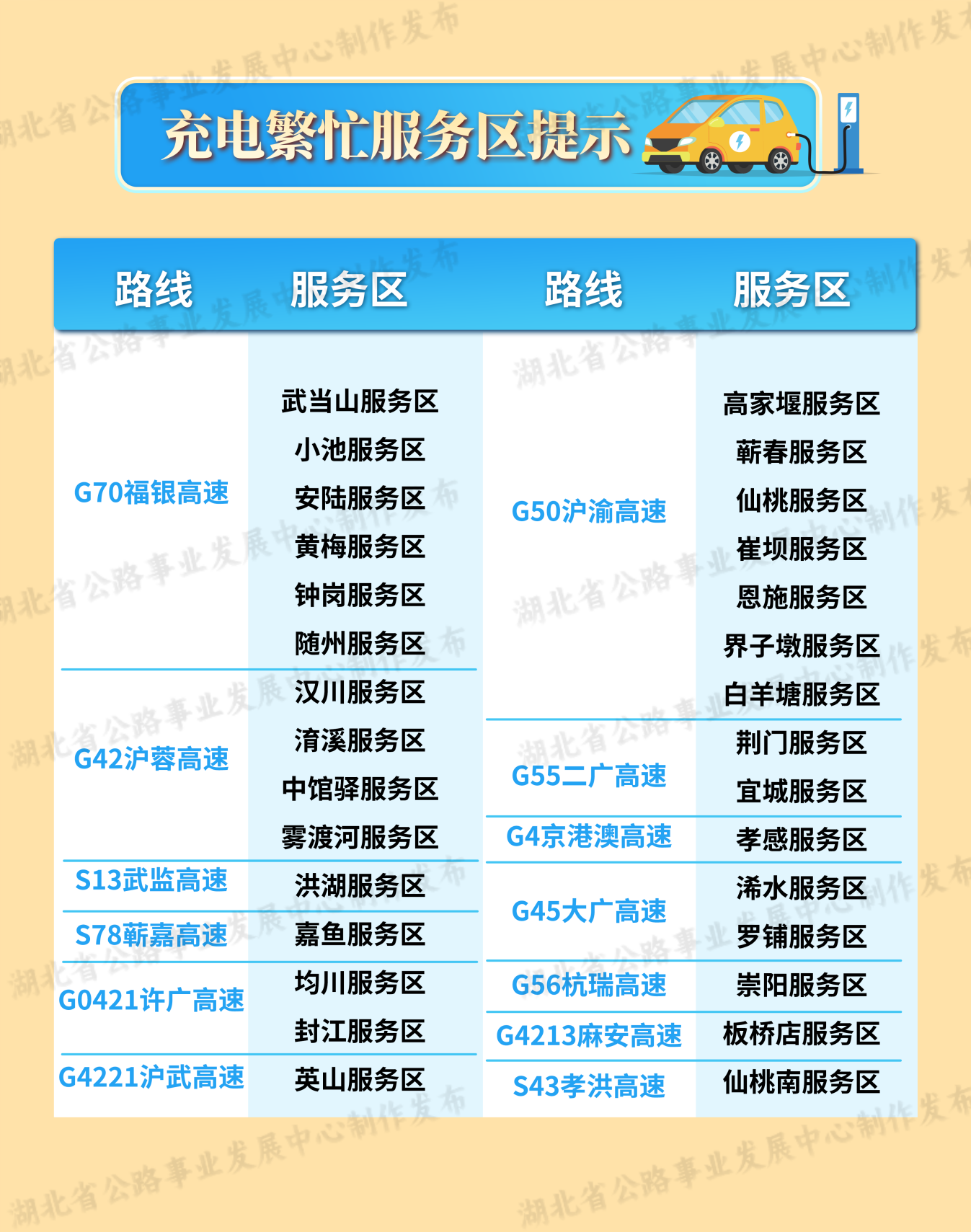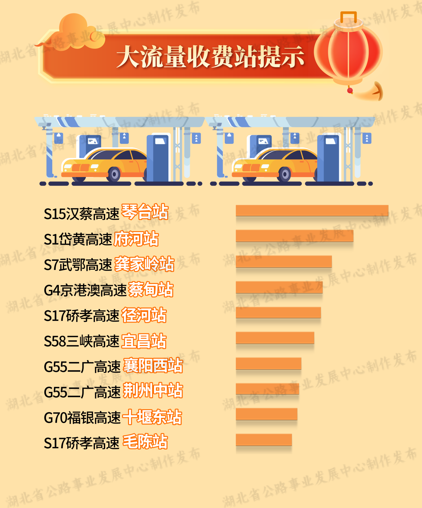 流量集中的高速公路收費站主要有S15漢蔡高速琴臺站,S1岱黃高速府河站,S7武鄂高速龔家?guī)X站,G4京港澳高速蔡甸站,S17硚孝高速徑河站,S58三峽高速宜昌站,G55二廣高速襄陽西站、荊州中站,G70福銀高速十堰東站,S17硚孝高速毛陳站。