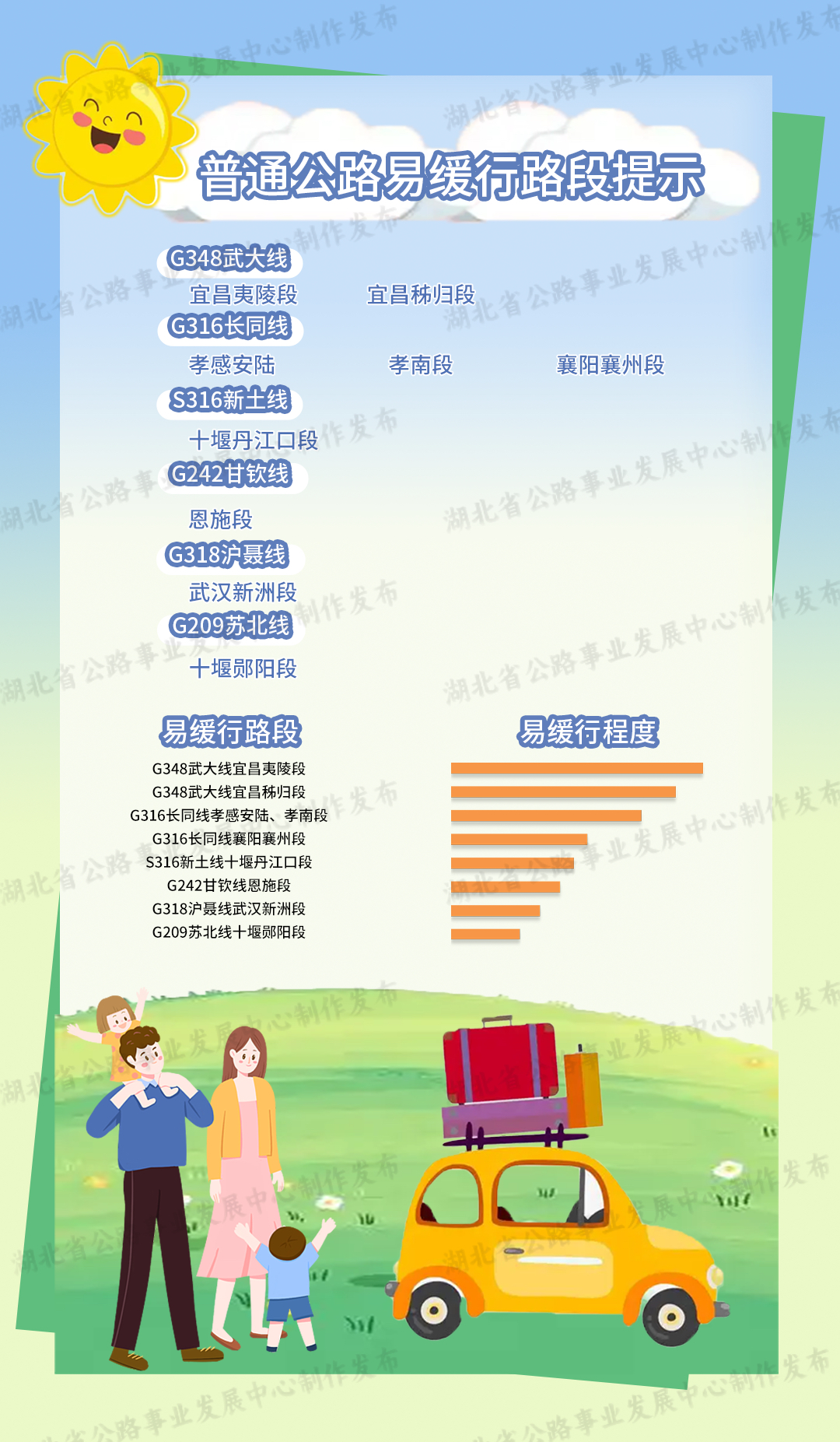 普通國省干線擁堵緩行主要集中在G348武大線宜昌夷陵段,宜昌秭歸段,G316長同線孝感安陸、孝南段,襄陽襄州段,S316新土線十堰丹江口段,G242甘欽線恩施段,G318滬聶線武漢新洲段,G209蘇北線十堰鄖陽段。