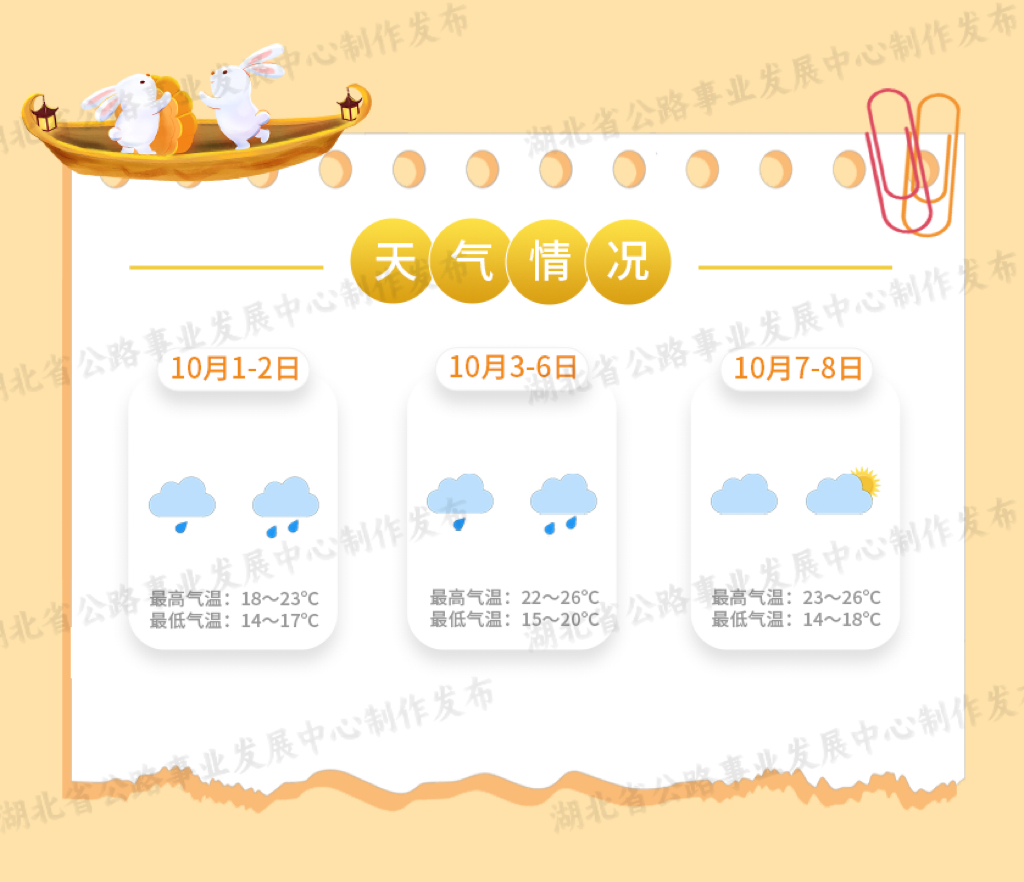湖北省公路事業(yè)發(fā)展中心經(jīng)與省氣象服務中心會商研判,預計中秋國慶假期期間,我省多降水,氣溫有起伏。1日-2日全省有小到中雨,部分地區(qū)有大雨;3-6日全省還將有一次降水過程,省內(nèi)大部地區(qū)小到中雨;7-8日天氣轉好,大部陰天到多云,西部有小雨。具體預報如下: