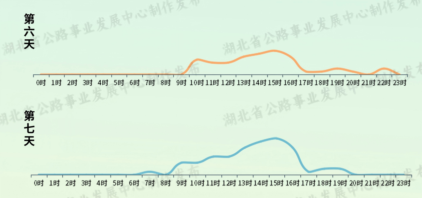 高速公路擁堵緩行主要集中在G50滬渝高速北河至仙桃段、賀家坪至榔坪段、蘄春至散花段,G42滬蓉高速應城至京山南段、東西湖互通至漢川段、當陽西至雙蓮段,G4京港澳高速孝感至武漢北段,G0421許廣高速朱河至白螺段,G4221滬武高速汪集至周鋪互通段,G70福銀高速云夢至安陸段。