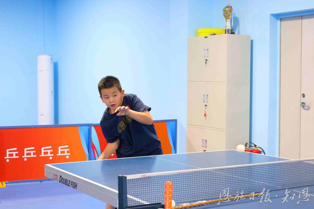 黃宇澤正在進行乒乓球訓練。(全媒體記者盧樹彬 攝)