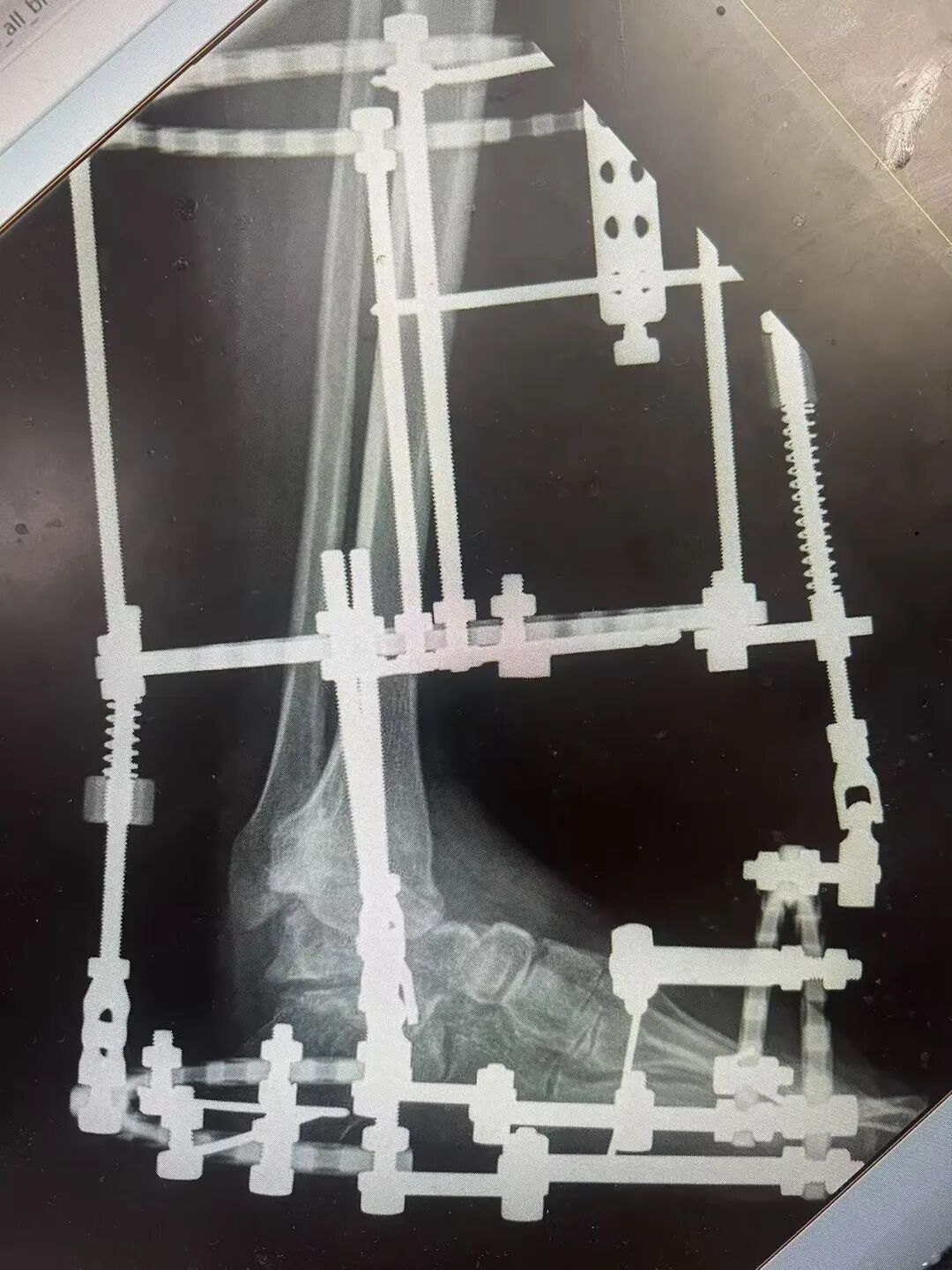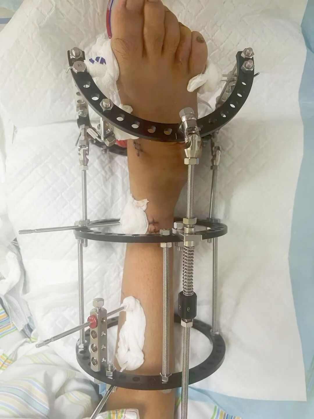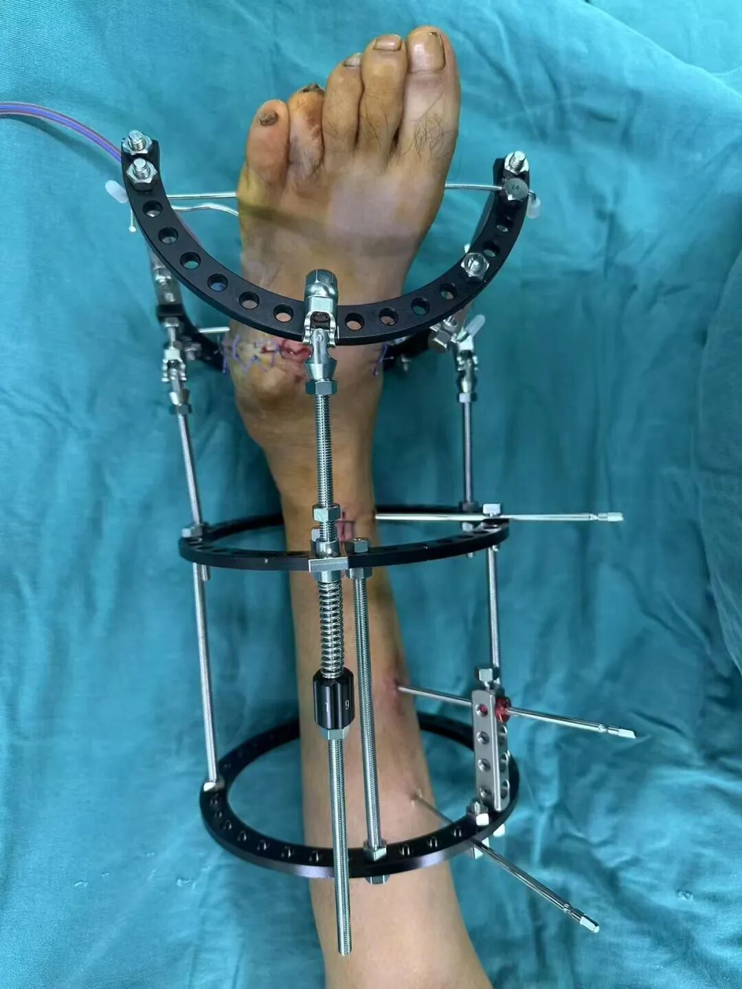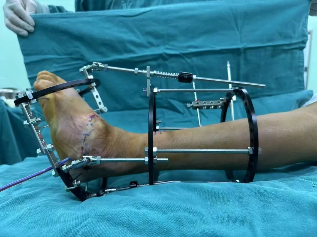 針對陽先生的復雜情況,鄭群龍醫(yī)師團隊制定了詳盡的手術方案:左踝關節(jié)融合+馬蹄足畸形矯正+跟腱延長+外固定架固定術。手術的核心,正是伊里扎洛夫技術。這項技術如同精密的“時空建筑學”,通過微創(chuàng)安裝環(huán)形外固定架,前足-后足安裝鋼環(huán),再將足的鋼環(huán)與脛骨的固定鋼環(huán)在踝關節(jié)前、后、左、右用帶關節(jié)的螺紋桿連接,由此構建成一個能體外牽拉調控的三維立體構型,在術后進行精準、緩慢的調整,一寸一寸逐步將畸形的骨骼、軟組織恢復到正常位置。