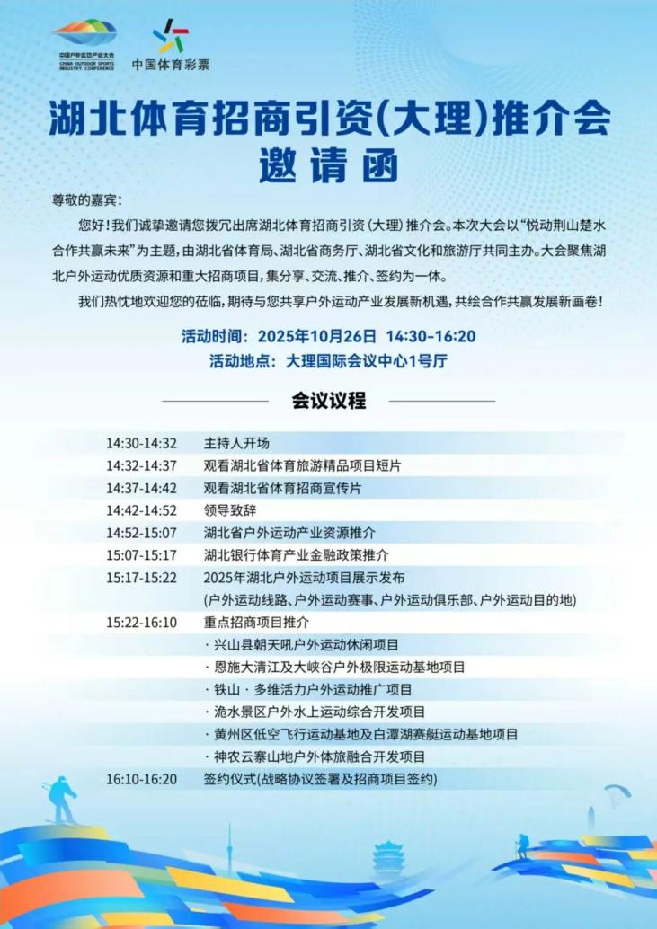 為貫徹體育產(chǎn)業(yè)高質(zhì)量發(fā)展部署,釋放湖北戶外運動資源優(yōu)勢,搭建跨區(qū)域合作平臺,由湖北省體育局、湖北省商務(wù)廳、湖北省文化和旅游廳聯(lián)合主辦的2025中國戶外運動產(chǎn)業(yè)大會湖北專場推介活動,將于10月26日14:30-16:20在云南大理國際會議中心1號廳重磅舉行。