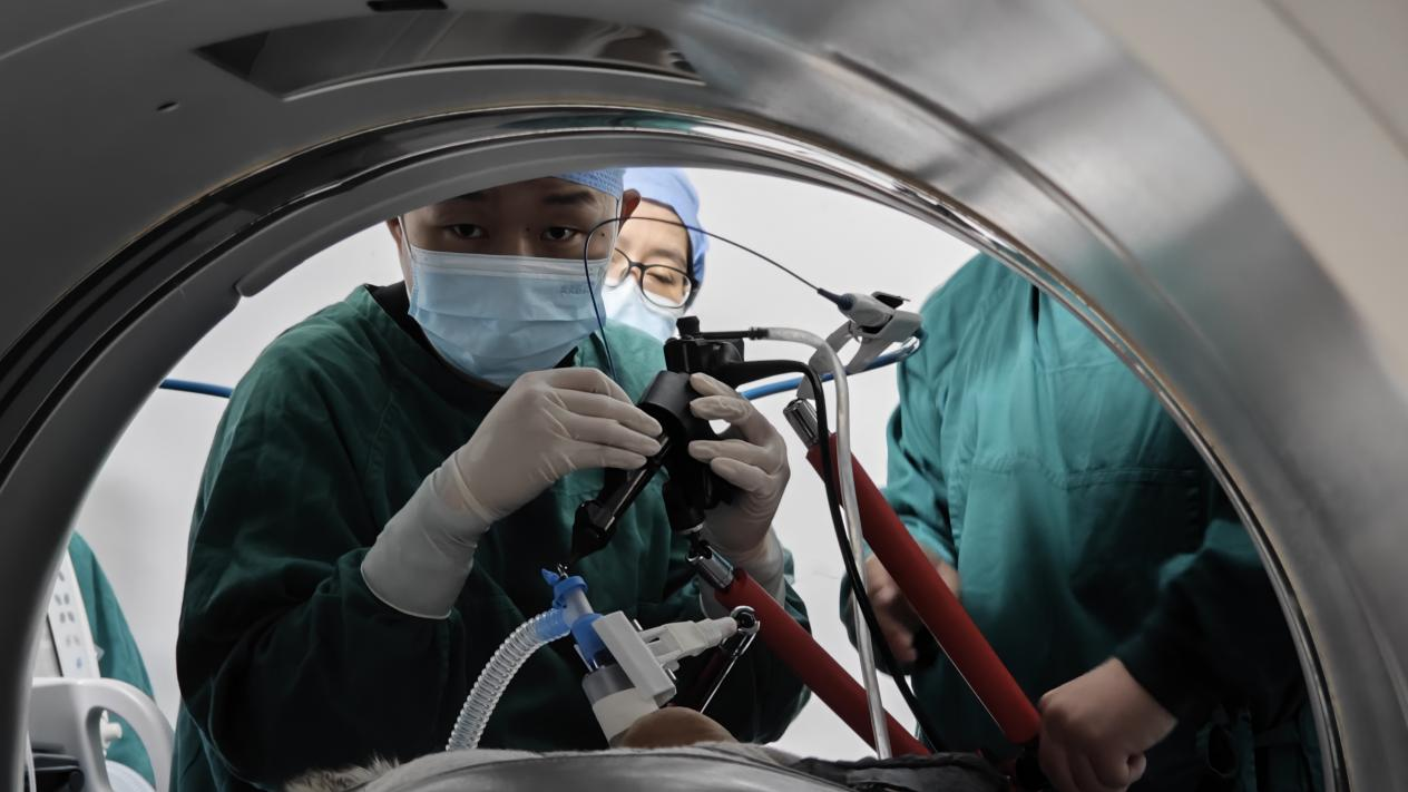 在AI+AR導(dǎo)航引導(dǎo)下,團(tuán)隊(duì)于患者目標(biāo)肺段支氣管用徑向超聲探查到實(shí)性低回聲區(qū)域,隨后通過(guò)支氣管鏡擴(kuò)張導(dǎo)管引導(dǎo)冷凍消融探頭至目標(biāo)位置。經(jīng)局部CT掃描確認(rèn)定位精準(zhǔn)后,采用“冷凍10分鐘、復(fù)溫2分鐘”的循環(huán)模式,術(shù)中最低溫度達(dá)零下156℃,最高溫度50℃,共計(jì)四個(gè)循環(huán)冷凍消融處理,復(fù)查胸部CT消融范圍基本達(dá)到預(yù)期。整個(gè)手術(shù)過(guò)程中,患者生命體征平穩(wěn),未出現(xiàn)并發(fā)癥。術(shù)后經(jīng)短期觀察,兩名患者恢復(fù)良好,均順利出院。