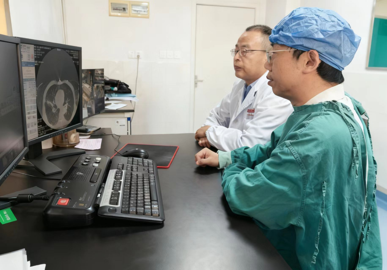 針對(duì)兩名患者的復(fù)雜病情,醫(yī)院?jiǎn)?dòng)MDT多學(xué)科聯(lián)合診療機(jī)制。放射影像科、核醫(yī)學(xué)科、疼痛科、胸外科、腫瘤科等多學(xué)科專(zhuān)家共同研討,呼吸與危重癥醫(yī)學(xué)科劉鈞副主任醫(yī)師、邱琦主治醫(yī)師等反復(fù)評(píng)估患者病情,經(jīng)與家屬充分溝通后,最終決定采用AI+AR光學(xué)導(dǎo)航支氣管鏡聯(lián)合徑向超聲引導(dǎo)下的冷凍消融術(shù),在精準(zhǔn)作用于病灶的同時(shí),最大程度保護(hù)患者肺功能。