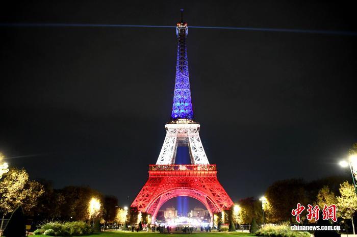 當(dāng)?shù)貢r(shí)間11月12日晚,巴黎埃菲爾鐵塔點(diǎn)亮象征法國(guó)的亮紅、白、藍(lán)燈光,悼念十年前巴黎系列恐怖襲擊的遇難者,表達(dá)國(guó)家團(tuán)結(jié)?!≈行律缬浾?李洋 攝