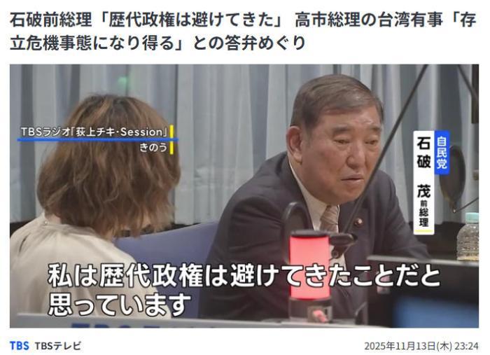 11月13日,日本前首相石破茂在TBS電臺(tái)節(jié)目中,對(duì)高市的言論表示反對(duì)。