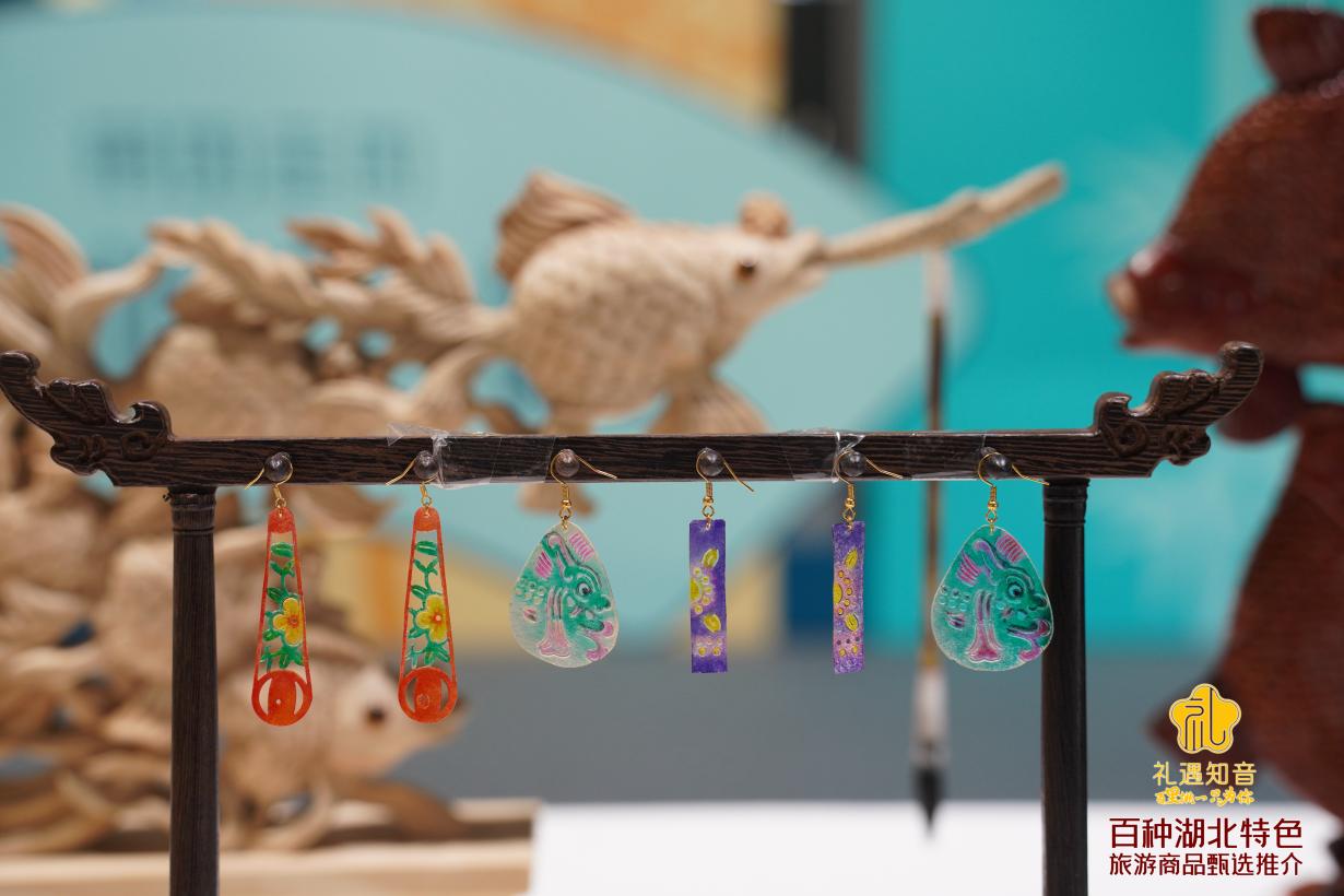 在“非遺精粹”區(qū),傳統(tǒng)手藝煥發(fā)全新生命力。楚韻真絲方巾,把江漢風(fēng)光織進(jìn)絲緞;土家織錦西蘭卡普,將撞色美學(xué)融入設(shè)計;非遺皮影被微縮成藝術(shù)耳環(huán),華容土布制成的保齡球手提包,將時尚度拉滿;還有曾侯乙編鐘套裝、黃鶴樓詩詞指甲鉗等精巧小物,令人愛不釋手——它們不只是物件,更是可穿戴、可分享的荊楚文化。