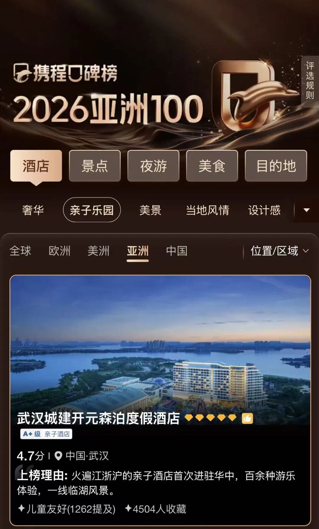 近日,攜程平臺(tái)發(fā)布《攜程口碑榜2026年度榜單》,武漢城建開元森泊度假酒店成功上榜亞洲親子樂(lè)園酒店百?gòu)?qiáng),位列亞洲第58位、國(guó)內(nèi)第29位,成為湖北省唯一上榜的酒店。