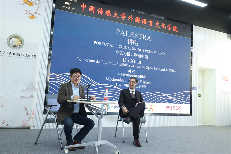 中央歌劇院交響樂團首席杜玄(左)與葡萄牙駐華使館教育及文化專員路易斯·佩斯塔納(右)進行分享。活動主辦方供圖