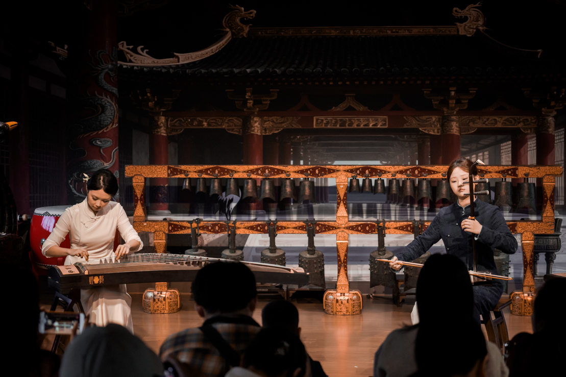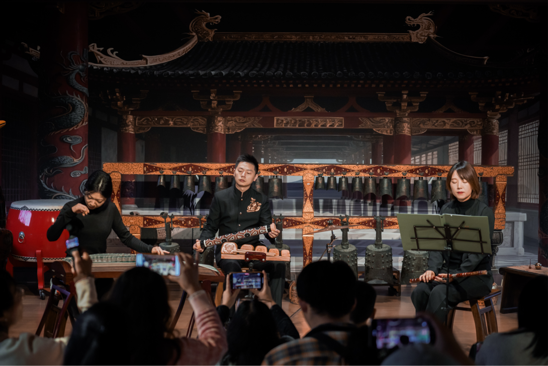 荊州博物館以“讓文物從展柜走向舞臺”為底色:編鐘廳的古雅空間成為演出主場,戰(zhàn)國漆器展柜與《紀(jì)南城·砥礪》的編磬聲共振,曾侯乙墓出土的羽調(diào)式音階融入樂曲創(chuàng)作,館內(nèi)藏有的楚文化脈絡(luò)更成了音樂會“楚墟新聲”板塊的核心靈感源。從章華臺到銅綠山,荊州博物館的考古資源,讓沉睡的遺址變成了旋律里的“楚魂載體”。