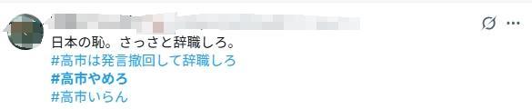 在社交媒體平臺(tái)上,出現(xiàn)了“高市辭職”“高市住手”“請(qǐng)高市撤回發(fā)言”等多個(gè)標(biāo)簽。日本網(wǎng)民紛紛表示,高市的錯(cuò)誤言論給日中關(guān)系埋下隱患,希望她盡快道歉。