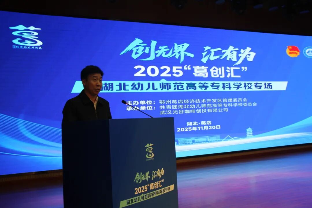 葛店國家經(jīng)開區(qū)管委會副主任柳金旗在致辭中高度評價了湖北幼專在幼教人才培養(yǎng)與創(chuàng)新創(chuàng)業(yè)教育方面的特色實踐。他表示,葛店開發(fā)區(qū)始終將高校作為區(qū)域創(chuàng)新的策源地與人才引擎,持續(xù)迭代"天天有咖啡、周周有路演、月月創(chuàng)投匯"的雙創(chuàng)服務(wù)生態(tài),為青年創(chuàng)業(yè)者提供全周期、專業(yè)化的成長支持。一直以來,葛店國家經(jīng)開區(qū)致力于為追夢者提供最優(yōu)渥土壤、最貼心服務(wù)、最廣闊舞臺,將全力發(fā)揮政策引導(dǎo)與平臺樞紐作用,激活區(qū)域創(chuàng)新活力,推動更多優(yōu)質(zhì)項目落地生根、開花結(jié)果,讓青年創(chuàng)新的"星星之火"在葛店這片產(chǎn)業(yè)熱土上形成"燎原之勢",為湖北建設(shè)全國構(gòu)建新發(fā)展格局先行區(qū)貢獻(xiàn)青春力量。