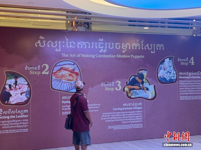 當?shù)貢r間11月25日,《時光之影》皮影特展在金邊展出多件柬埔寨傳統(tǒng)皮影作品。圖為一名觀眾在觀看柬埔寨大皮影制作工藝展示墻?!妼殐x 攝