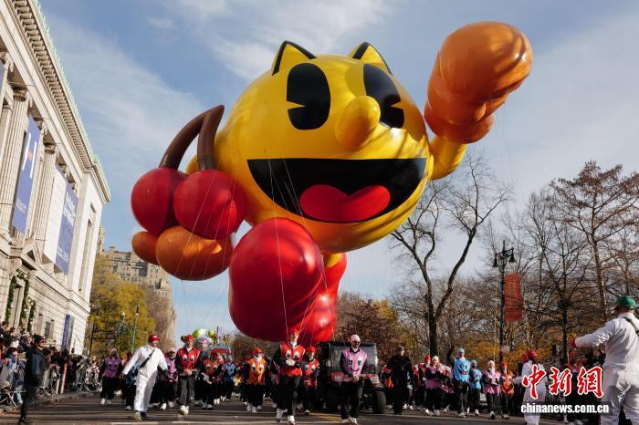 當(dāng)?shù)貢r間11月27日,第99屆梅西百貨感恩節(jié)大游行在美國紐約舉行。圖為“吃豆人”巨型氣球首次亮相紐約感恩節(jié)大游行?!≈行律缬浾?王帆 攝