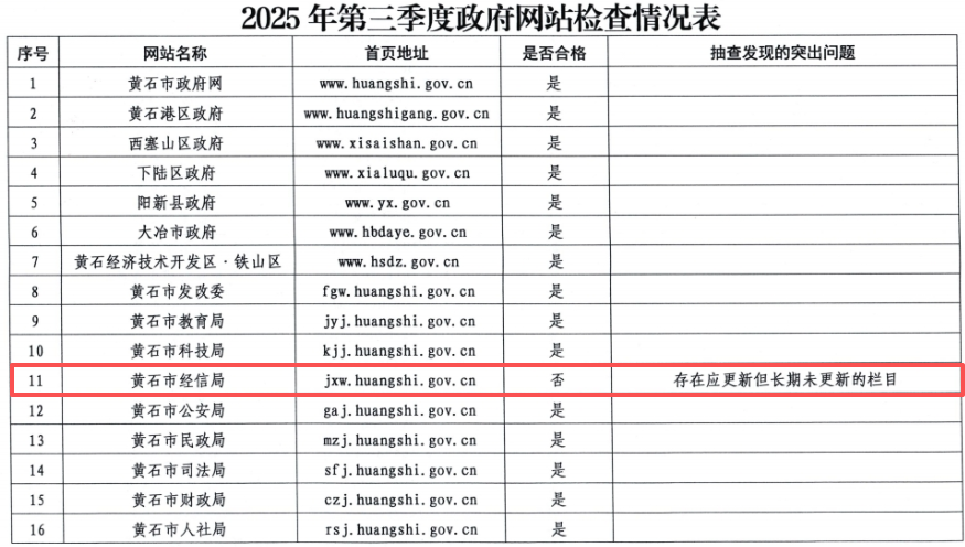 通報稱,黃石市政務服務管理局嚴格按照國務院辦公廳《政府網站與政務新媒體檢查指標》和省政府辦公廳《湖北省政府網站管理辦法》相關要求執(zhí)行,對全市36家網站進行檢查,檢查率100%。其中合格網站35家,不合格網站1家,合格率97.2%。共檢查了163個政務新媒體,其中合格162家,不合格1家,合格率為99.4%。