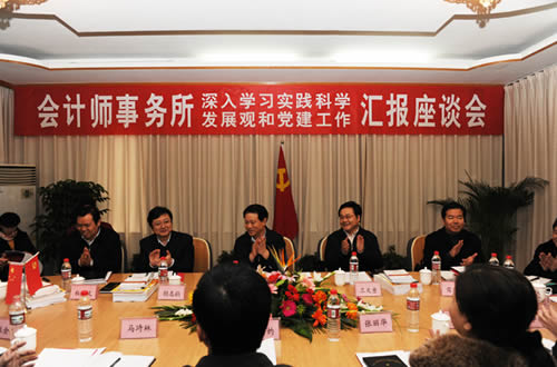 在座談會上,潘立剛同志分別聽取了王文童同志關于全省會計師事務所開展深入學習實踐科學發(fā)展觀活動和注冊會計師行業(yè)黨建工作情況的匯報,武漢市財政局總會計師、市財政局會計師事務所深入學習實踐科學發(fā)展觀活動指導小組副組長張灼、襄樊市財政局副局長、市財政局會計師事務所深入學習實踐科學發(fā)展觀活動指導小組副組長馬琦林、咸寧市財政局黨組成員、市會計師事務所深入學習實踐科學發(fā)展觀活動指導小組副組長張麗華以及中勤萬信會計師事務所黨支部書記、董事長張金才,武漢眾環(huán)會計師事務所董事長、武漢市注冊會計師行業(yè)黨委副書記黃光松,咸寧永興會計師事務所所長、咸安區(qū)政協(xié)委員張麗平等同志先后匯報發(fā)言。大信會計師事務所湖北分所、中瑞岳華會計師事務所湖北分所、武漢興業(yè)會計師事務所、襄樊華炬會計師事務所黨支部書記也參加了此次座談。
