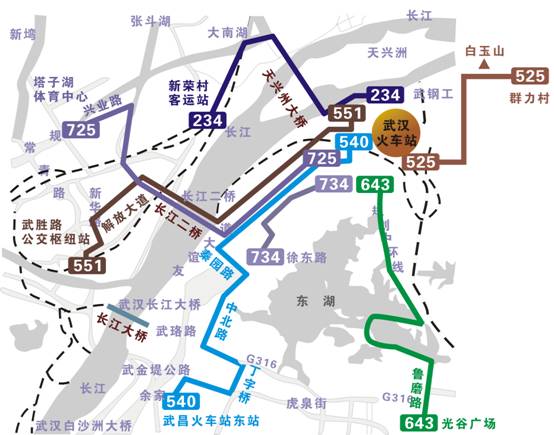 據(jù)悉,春運(yùn)期間,將根據(jù)客流變化情況,調(diào)整增加武漢站上述7條公交線路運(yùn)力,還將開(kāi)通武漢站至漢口站的大站快車線路。走向?yàn)椋何錆h站經(jīng)白云路、團(tuán)結(jié)大道、建設(shè)十路、友誼大道、長(zhǎng)江二橋、黃浦大街、發(fā)展大道、常青路至漢口站。