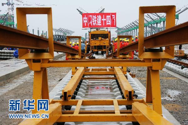 資料圖片:7月17日,中國鐵建十四局集團京滬高鐵鋪軌工班的工人們正在鋪設(shè)通道,為正式鋪軌進行準備。京滬高鐵先導試驗段北段將于7月19日開始率先從徐州向蚌埠鋪軌,南段將于8月中旬從南京向蚌埠鋪軌,10月底將完成試驗段鋪軌。京滬高速鐵路全長1318公里,全線縱貫京津滬三大直轄市和河北、山東、安徽、江蘇四省,是我國目前最長的客運專線之一。新華社發(fā)(劉文攝)