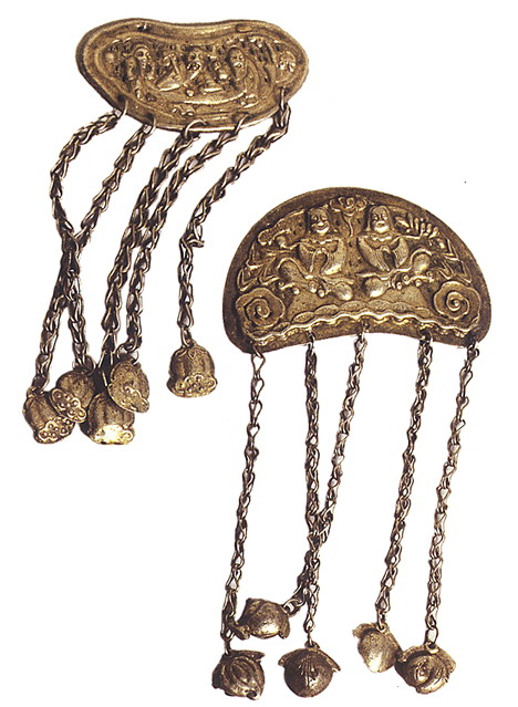 銀飾以白銀為原料,純度高,久用耐磨,不易腐蝕,光澤奪目,極顯高貴;一般為富裕人家的飾物,常有耳墜、戒指、手鐲、發(fā)簪、手鏈等。最為精彩的是帽飾人物,常用高浮雕、淺浮雕、鑲嵌和鏤空的表現(xiàn)手法,圖案多為龍鳳吉祥、長命富貴、麒麟送子等。